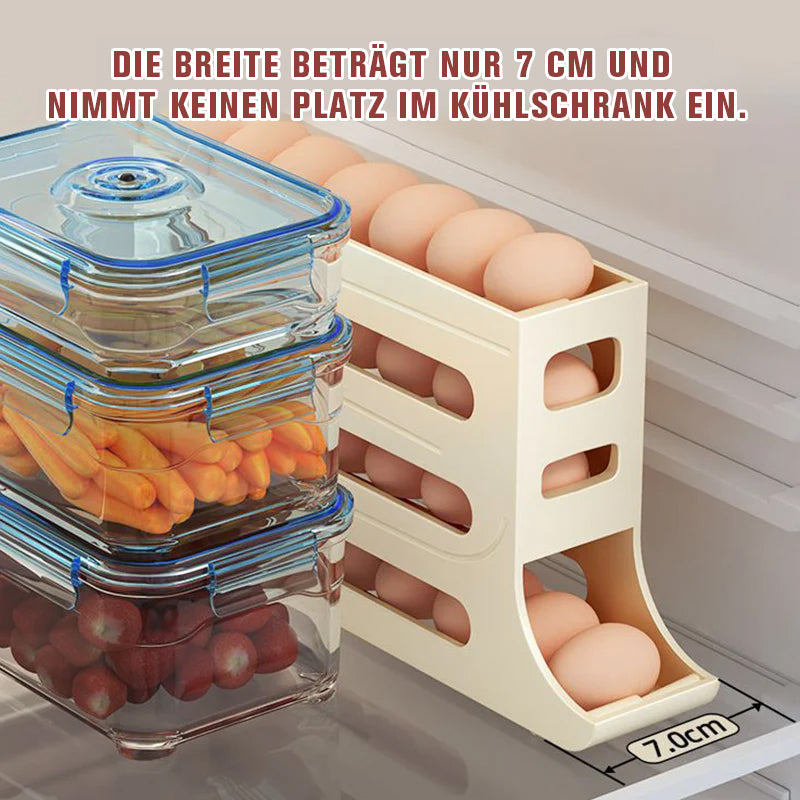 Rollender Mechanismus für Frische: Durch einen Rollmechanismus verhindert dieses Eierregal, dass sich Eigelb und Eiweiß absetzen, was die Frische der Eier fördert und sicherstellt, dass sie in optimalem Zustand bleiben. Der Rollmechanismus verhindert Ablagerungen und hält Ihre Eier frisch und gebrauchsfertig.
