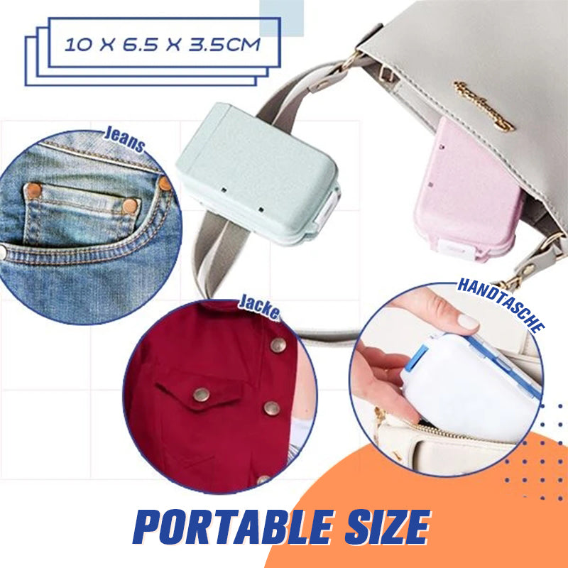 Diese tragbare Mini Pillendose kann in jedem kompakten Fach installiert werden. Es passt problemlos in Taschen, Geldbörsen und Rucksäcke und trägt alle täglichen Pillen gleichzeitig! Sehr gut geeignet für Reisen oder den täglichen Gebrauch, Sie können jederzeit und überall Medikamente einnehmen!