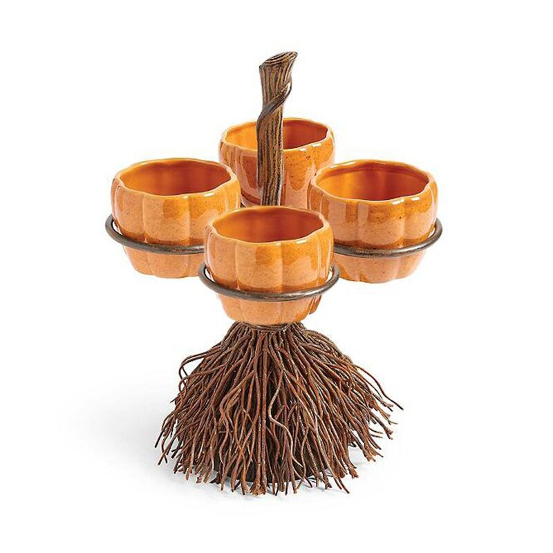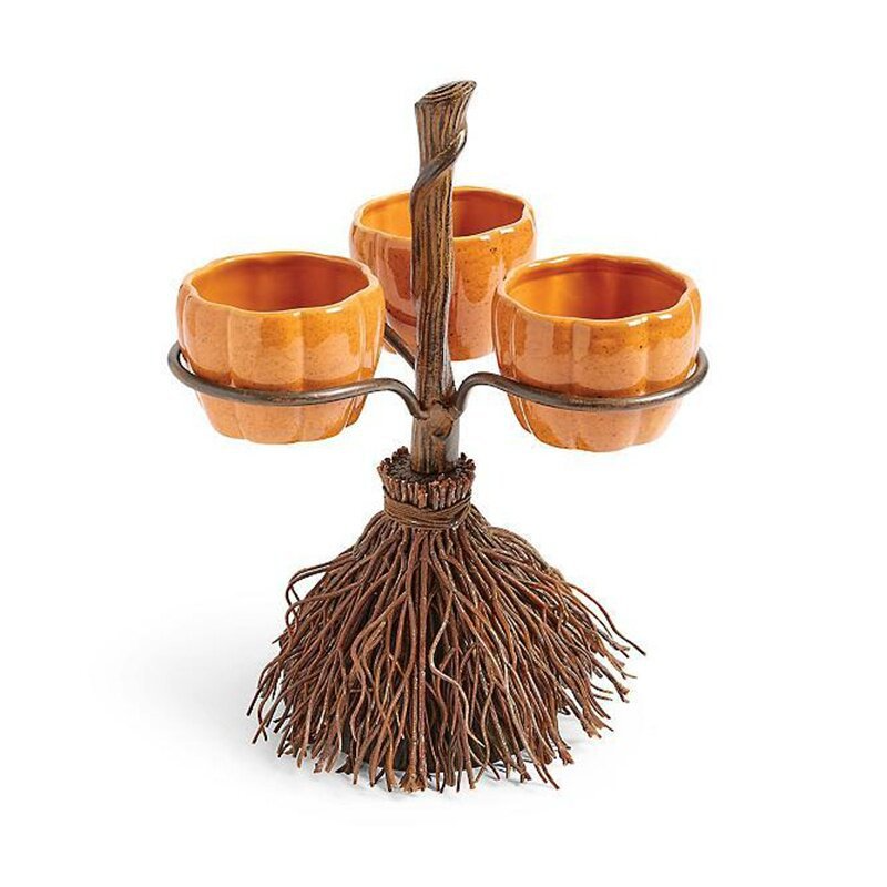 🎃🎃 Dieser authentisch aussehende Tischbesen trägt drei/vier kürbisförmige Keramikschalen zum Servieren aller Arten von Leckereien.