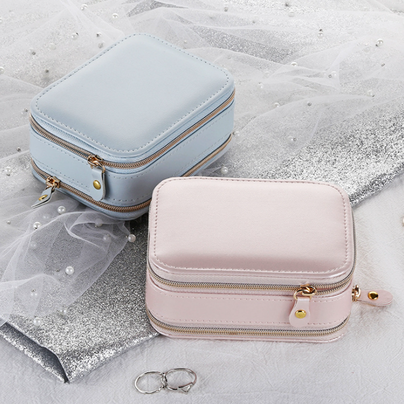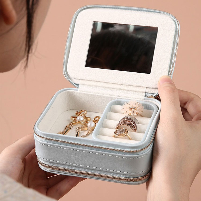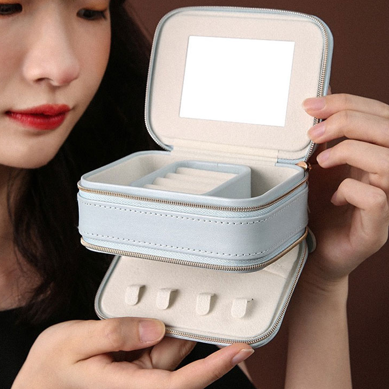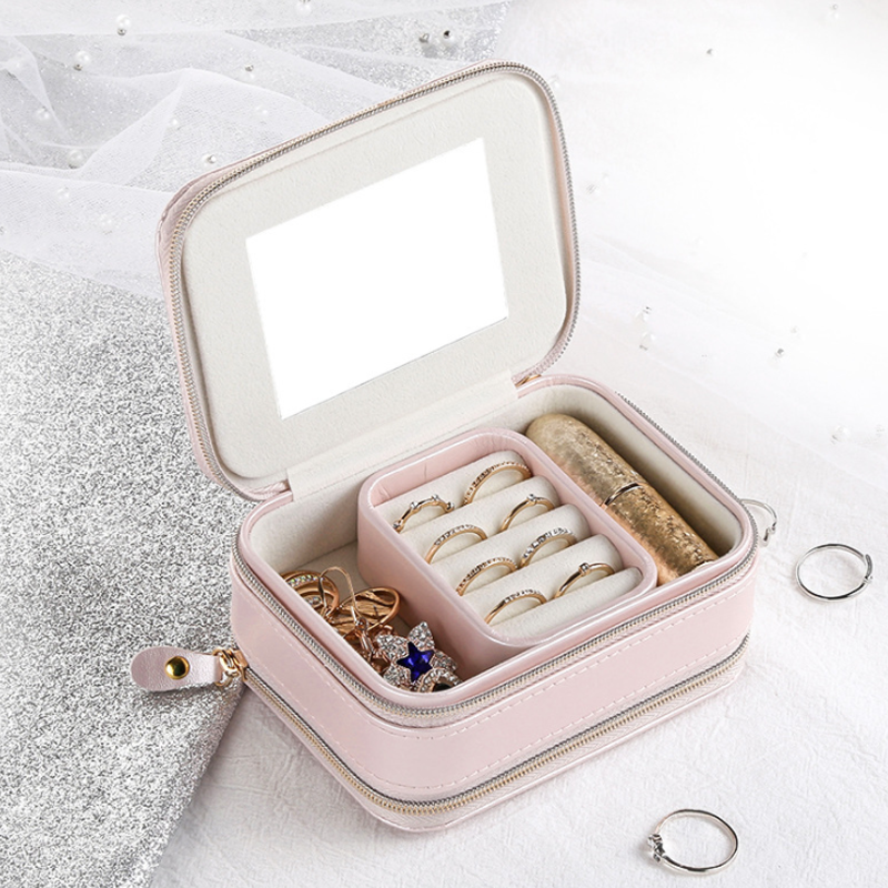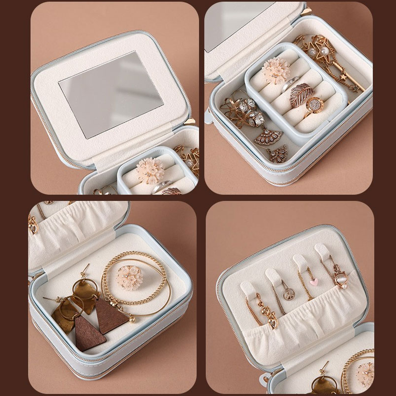 【KOMPAKTER & MODISCHER STIL】Dies ist eine kleine, kompakte und modische Schmuckschatulle mit zwei Reißverschlüssen in beiden Schichten und einem kleinen Spiegel im Deckel.