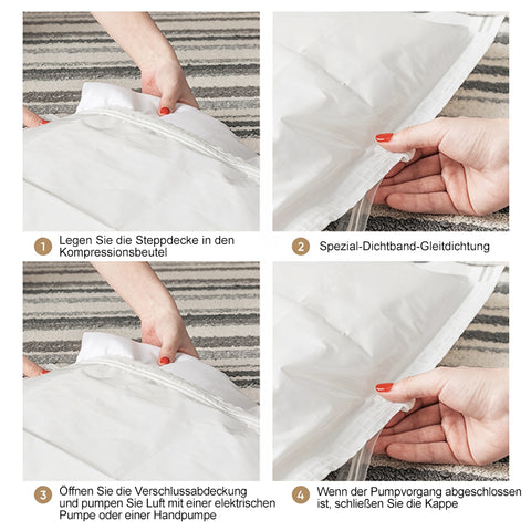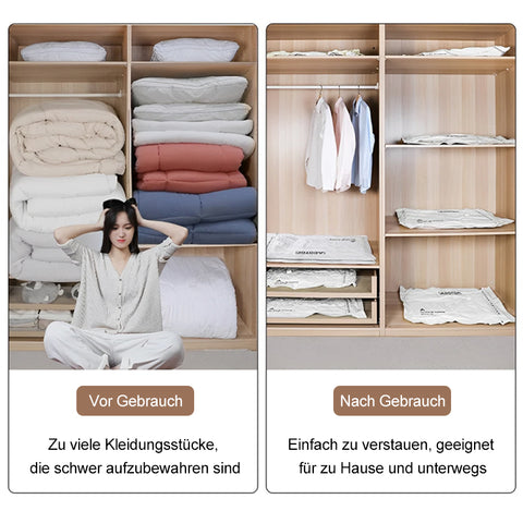 Größere Kapazität: Das innovative erweiterbare Design ermöglicht es dem Vakuumbeutel, mehr Kleidung oder Steppdecken aufzunehmen, wodurch 80 % des Platzes in Schränken, Kleiderschränken, Dachböden und Gepäck frei werden.