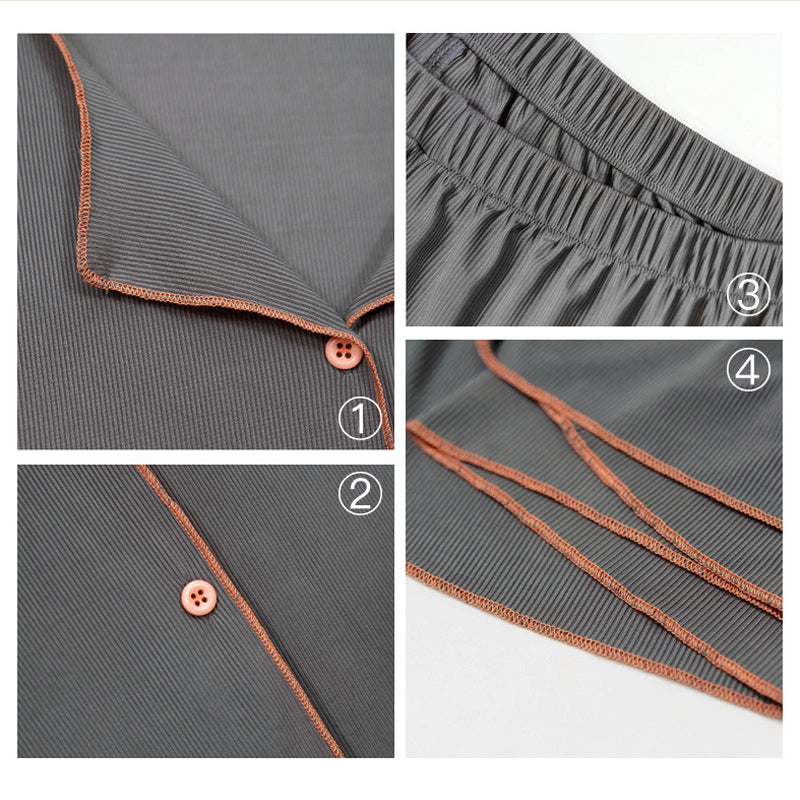 Das Nachtwäsche-Pyjama-Set aus Eisseide für Damen besteht aus einem geknöpften Nachthemd mit kurzen Ärmeln und einer Shorts mit elastischem Bund. Geeignet für das tägliche Tragen, Faulenzen, Pyjama-Party, Brautnachtwäsche, Hotel, Berufung und Reisen.