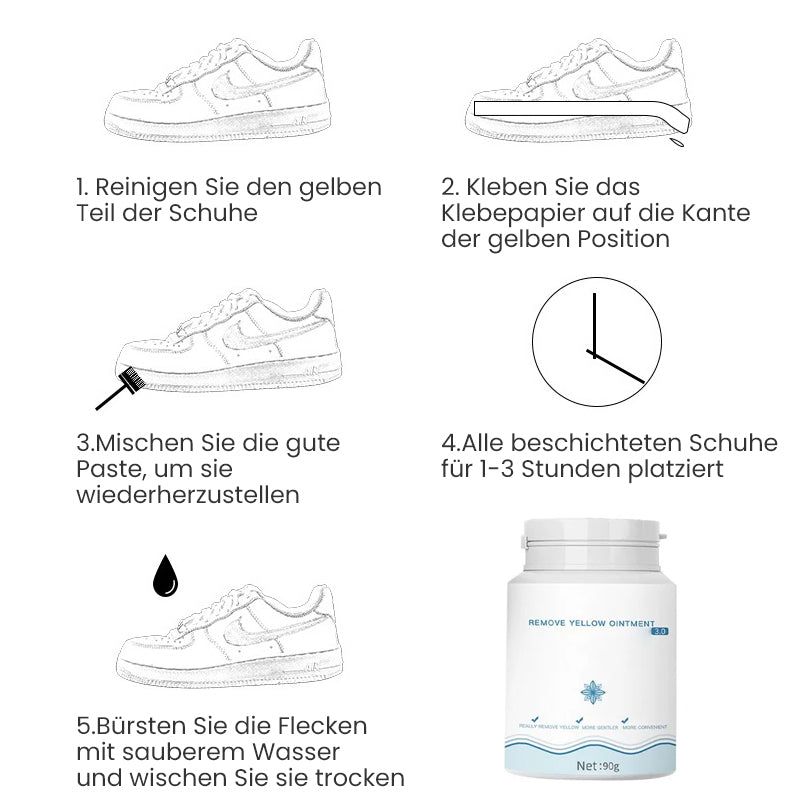 Im Gegensatz zu anderen Produkten, die Schuhe durch Abdecken aufhellen, entfernt es gelben Schmutz durch chemische Reaktion und stellt im Wesentlichen seine wahre Farbe wieder her. -