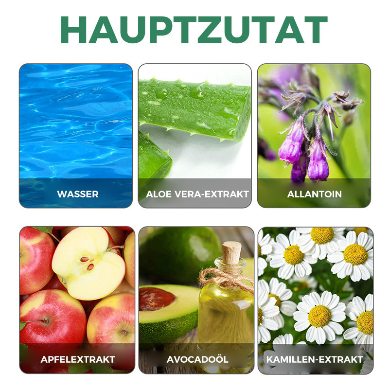 Produktinhaltsstoffe: Wasser, Aloe Vera-Extrakt, Allantoin, Apfelextrakt, Avocadoöl, Kamillenextrakt