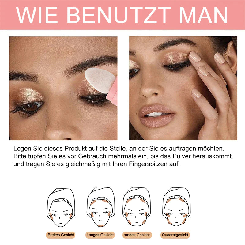 ✨[Spezielle Schwammschaumspitze] Die Schwammschaumspitze wurde entwickelt, um gleichmäßiger aufzutragen, ohne Pulver zu verstreuen. Es ist sehr bequem zu bedienen. Tupfen Sie einfach auf die Stelle, an der Sie Ihr Make-up wünschen, und der schimmernde Highlighter haftet auf Ihrer Haut. (Bei der ersten Verwendung bitte mehrmals darauf klopfen, bis das Pulver herauskommt)