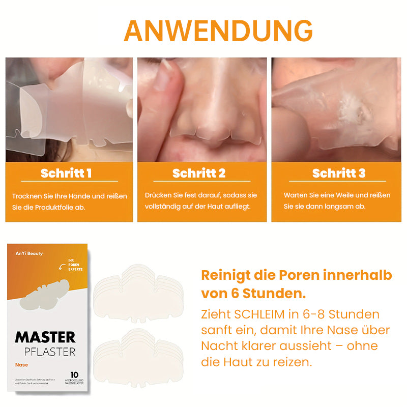 Einfache Anwendung: Trocknen Sie Ihre Hände nach der Reinigung des Gesichts und reißen Sie die Produktfolie ab. Drücken Sie fest darauf, sodass sie vollständig auf der Haut aufliegt. 6 Stunden einwirken lassen, dann den Streifen vorsichtig entfernen.