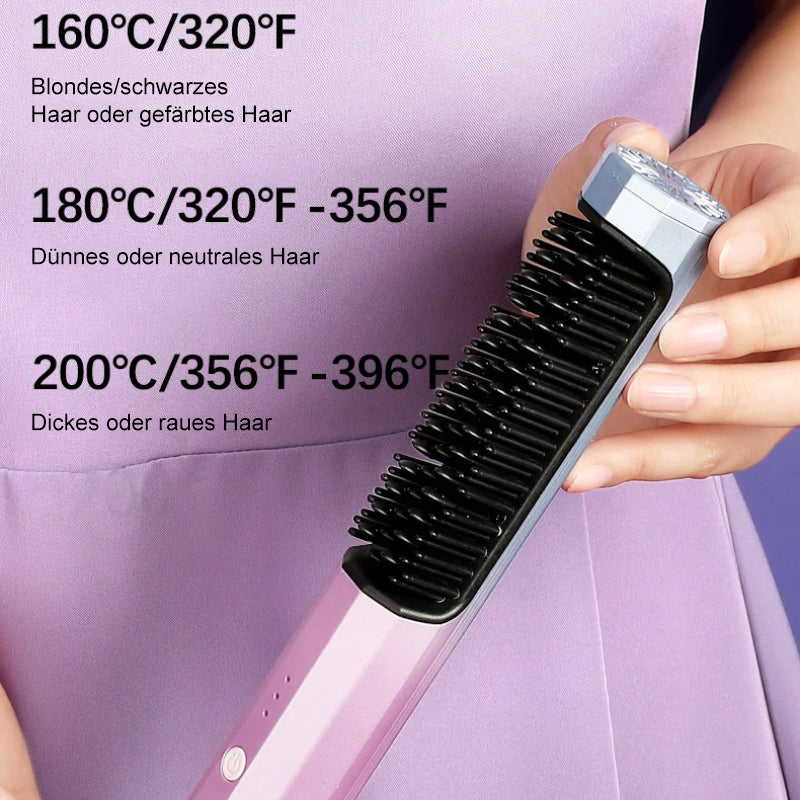 Lassen Sie krauses Haar hinter sich mit unserem fortschrittlichsten kabellosen Haarglätterkamm für ein glatteres, seidiges Finish unterwegs. Es entwirrt schnell unordentliches Haar und glättet krauses Haar.