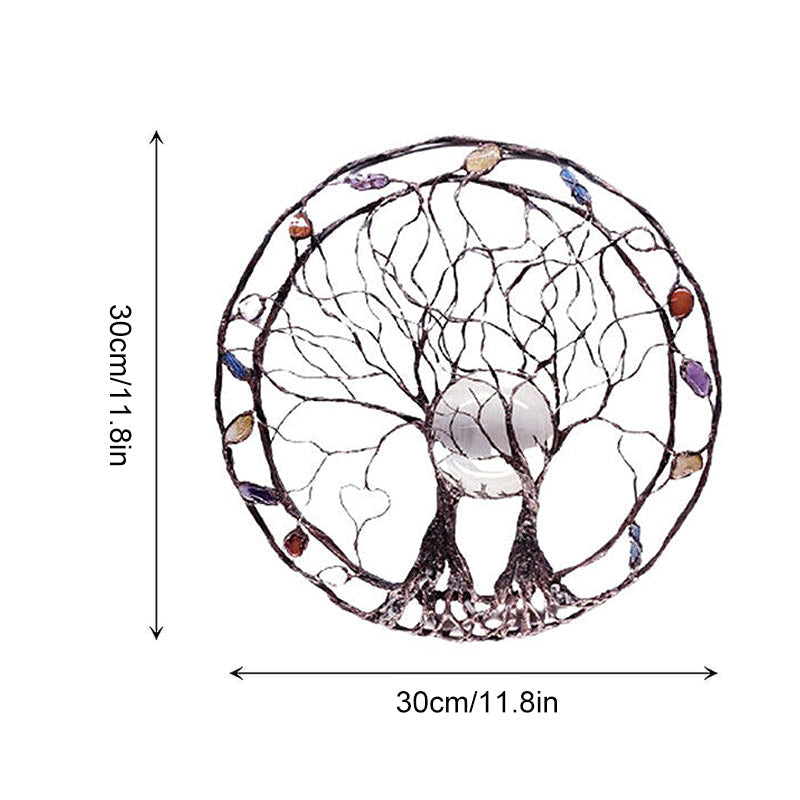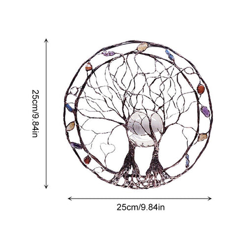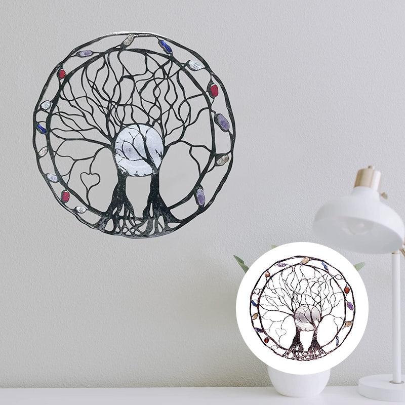 Kreis des Lebens Baumskulptur aus Metall, The Moon Huggers, Wand- oder Fensterkunst mit verträumtem Selenit-Vollmond und einer Mischung aus Mineralien.