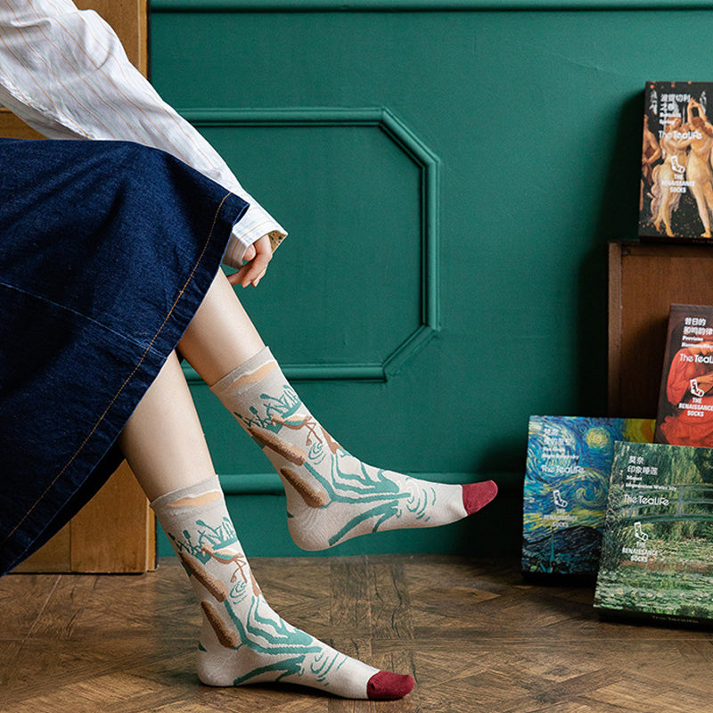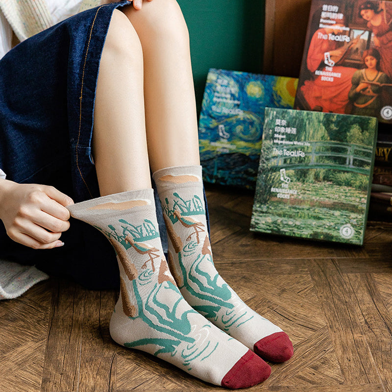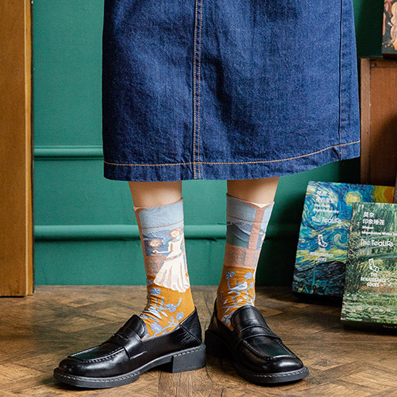 Klassische Motive aus der Ölmalerei: Die Damen Socken sind mit Motiven aus verschiedenen berühmten Gemälden versehen. Die verträumte und fantastische Sternennacht und der spannungsgeladene Schrei sind in unseren kunst Socken klar umrissen.