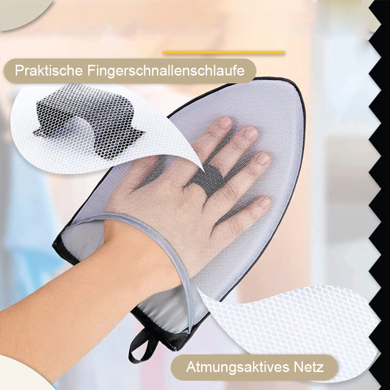 Es ist mit einem verlängerten und erweiterten Bereich ausgestattet, um sich jeder Handgröße anzupassen und schützt Ihre Handfläche und Ihr Handgelenk vollständig vor der Hitze. Das Pad hat einen atmungsaktiven Netzbezug, um Ihrer Hand eine gewisse Belüftung zu bieten und zu verhindern, dass sie während der Verwendung schwitzt. Darüber hinaus wird es mit einer praktischen Fingerschnallenschlaufe geliefert, um Ihrer Hand einen stabilen Halt und eine einfache Kontrolle zu geben. Verhindert das Verrutschen und passt sich ständig an, damit Sie Ihre Kleidung schnell bügeln oder dämpfen können, ohne sich zu verbrennen.