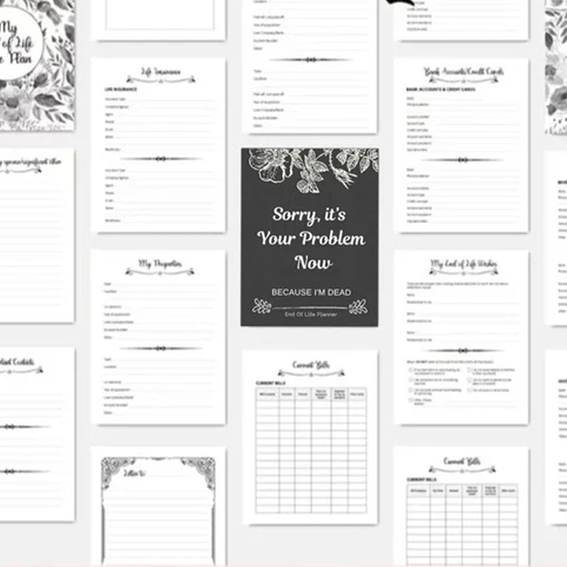 Unser gründlicher und lustiger End of Life Planner deckt alles ab, was Ihre Familie und/oder Freunde nach Ihrem Ableben oder Ihrer Entmündigung wissen müssen...., von finanziellen Informationen über Versicherungsinformationen bis hin zu Wünschen für die Pflege am Lebensende und mehr!