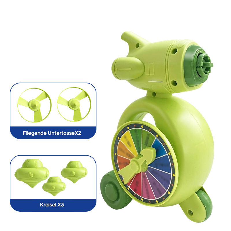 【Süße Disc und Gyro 2-in-1 Launcher】Dieses multifunktionale fliegende Disc Launcher Spielzeug beinhaltet 1 Pistole, 2 Untertassen, 3 Kreisel. Lassen Sie Kinder mehrere Spaß auf einmal erleben.