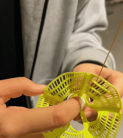 Installation: Das Set enthält 40 elastische Schnüre, die frei auf die gewünschte Länge geschnitten werden können, und 3 Balancierschnüre. Die weiße elastische Schnur und der gelbe Balancierdraht werden zusammen am Haken und am Kopf des Badmintonballs befestigt.