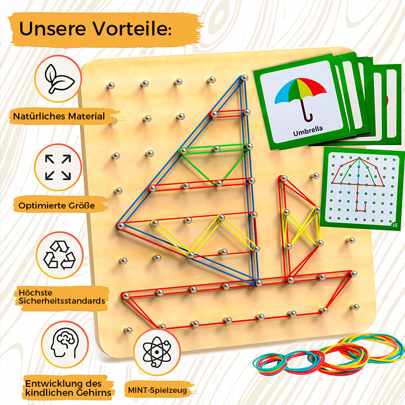 Dieses Spielzeug wird kleine Kinder begeistern und beschäftigen. Es ist ein einzigartiges und lehrreiches Werkzeug, mit dem Kinder Geometrie und mathematische Konzepte auf spielerische und kreative Weise erkunden können. Mit 30 Musterkarten und 40 Gummibändern können die Kinder eine Vielzahl von Formen und Figuren kreieren, die sie stundenlang unterhalten.