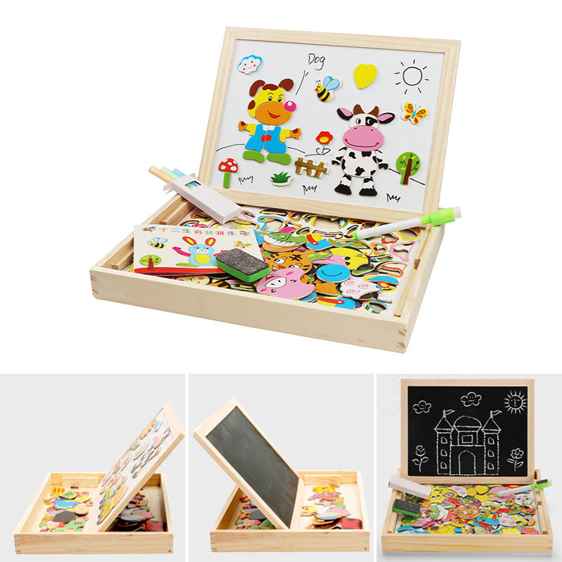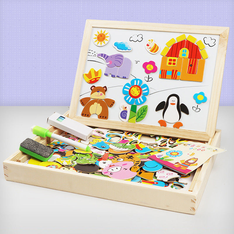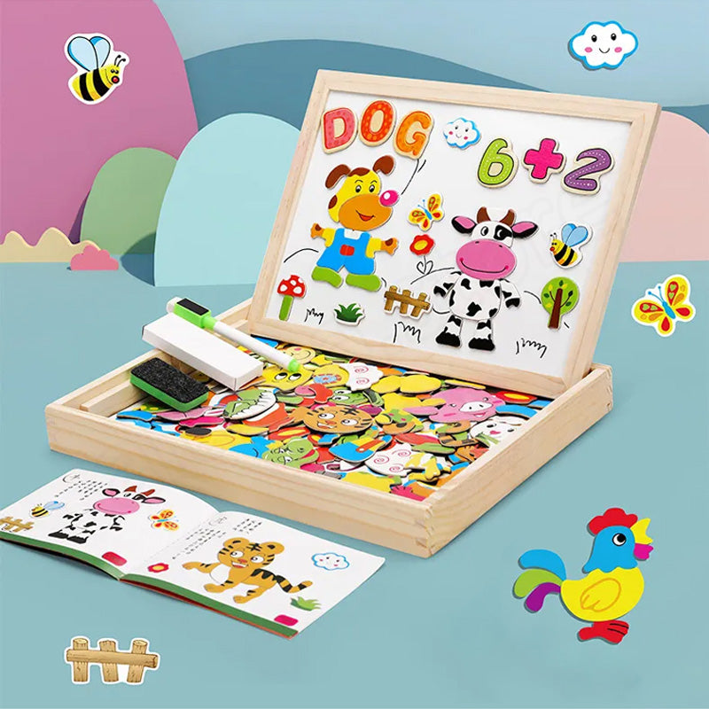Doppelseitige Kunsttafel, sowohl weiß als auch mit schwarzer Tafelkreide. Über 100 farbenfrohe Holzteile mit verschiedenen Tiermotiven und vollmagnetischer Rückseite