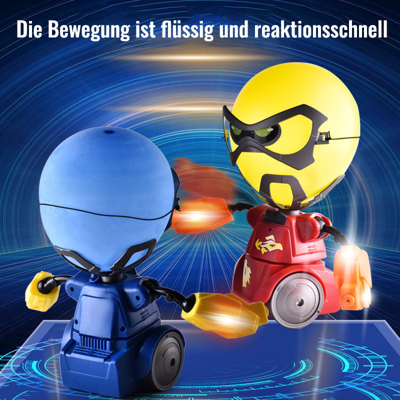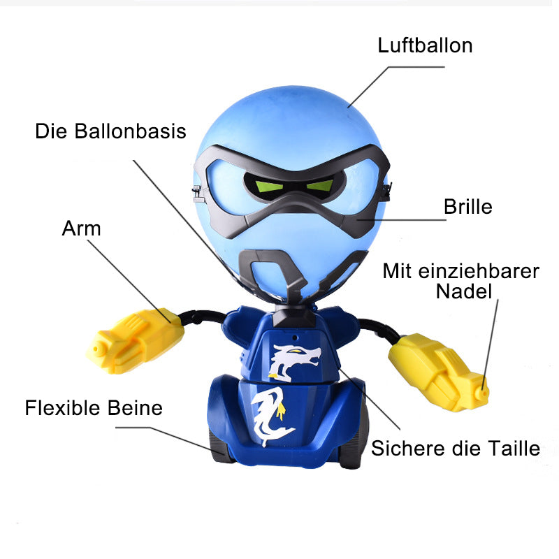 Befestigen Sie einen Ballon am Roboter, setzen Sie die abnehmbare Schutzbrille auf den Ballon, schalten Sie Ihren Roboter und Controller ein und seien Sie bereit für den Kampf! Schlage weiter und du gewinnst, wenn der Ballon deines Gegners platzt!