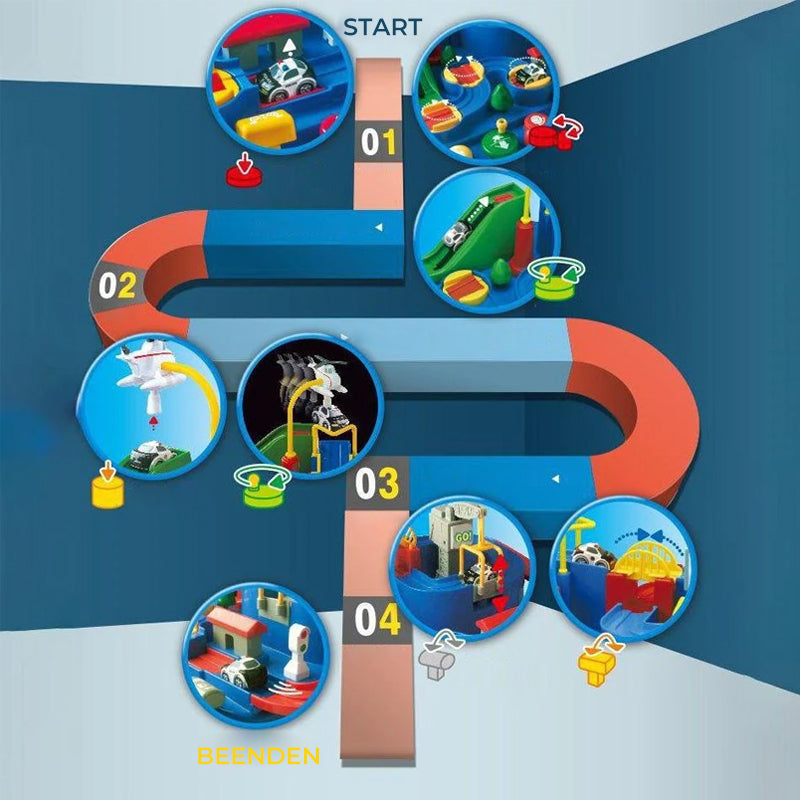 Diese aufregende Strecke bietet 8 verschiedene Herausforderungen, die die Fähigkeiten und die Koordination Ihrer Kinder auf die Probe stellen. Der beste Teil? Es eignet sich hervorragend für Trainingszwecke.