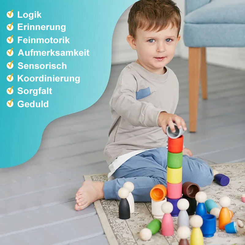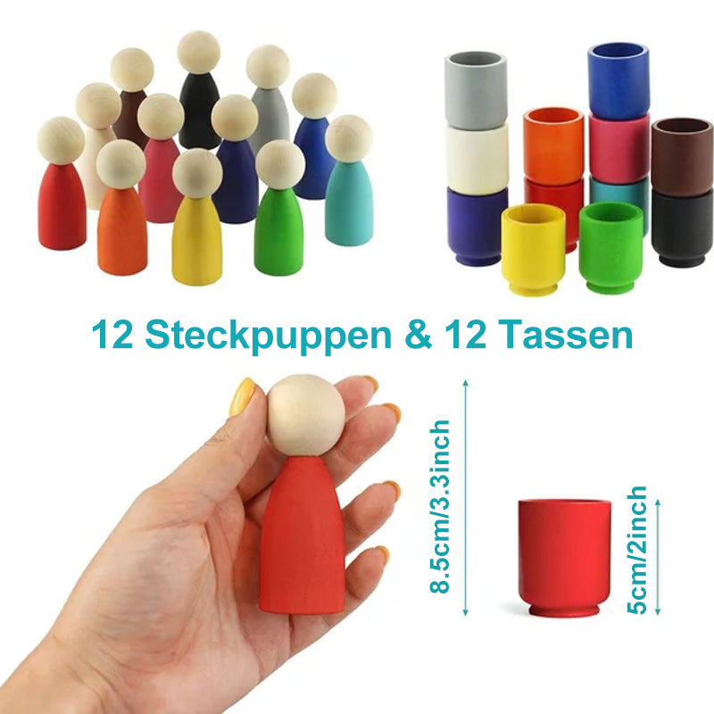Farbabstimmung und Klassifizierung: Das Baby sortiert die verschiedenfarbigen Pflockpuppen in die der Farbe entsprechenden Becher und fördert so das logische Denkvermögen des Kindes!
