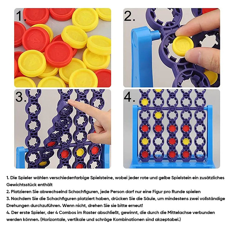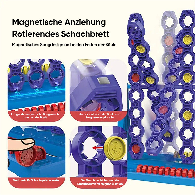 Interaktives Lernen: Das 4-in-einer-Linie-Spin-Spiel fördert das aktive Denken und die Hand-Auge-Koordination der Kinder während des Spiels. Das Platzieren von Schachfiguren und das Drehen der Säule erfordern die Kontrolle über die Armmuskulatur, fördern die Koordination und geistige Beweglichkeit und tragen zur allgemeinen kognitiven und körperlichen Entwicklung bei.