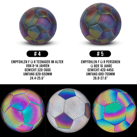 SPEKTAKULÄRER FUSSBALL LASST SIE AUFFALLEN - Dieser Fußball besteht aus einer neuen Generation von strapazierfähigem, reflektierendem PU-Leder, das dem Fußball einen helleren holografischen Effekt verleiht, wenn Licht auf den Fußball trifft. Ihre Freunde haben vielleicht noch nie einen so holografischen Fußball gesehen, er kann Sie auf den Fußballfeldern hervorheben.