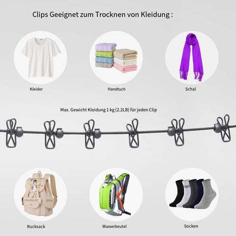 ❤☞ Anti-Rutsch-Design mit Positionierungsperlen - 12 Clips sind durch 13 schwarze Gummiperlen getrennt (können entlang des Seils gleiten), um zu verhindern, dass Gegenstände aufgrund von Gewicht oder Wind zusammenklumpen und den Effekt sichern. Machen Sie sich also keine Sorgen, dass Ihre Kleidung an einem windigen Tag herunterfällt.