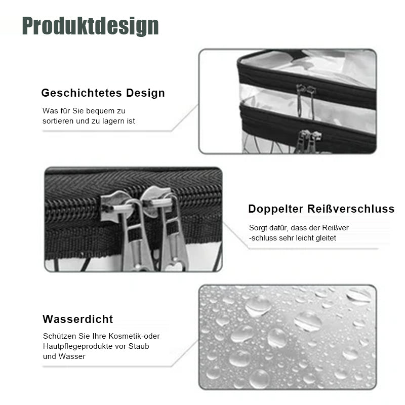 • Doppelter Reißverschluss: Eine transparente Kosmetiktasche aus robustem Reißverschluss mit dickem Doppelreißverschluss. Das hochwertige Design sorgt dafür, dass der Reißverschluss sehr leicht gleitet und nicht in den Ecken hängen bleibt.