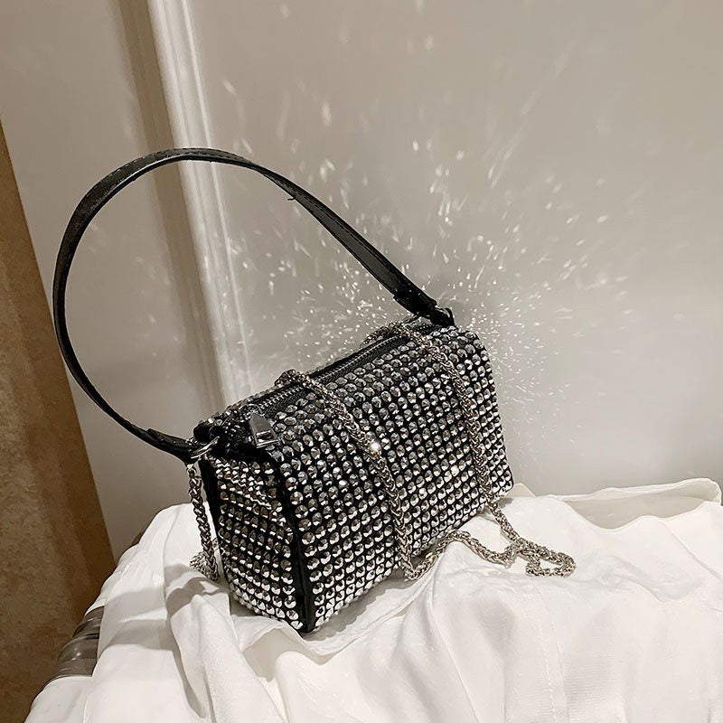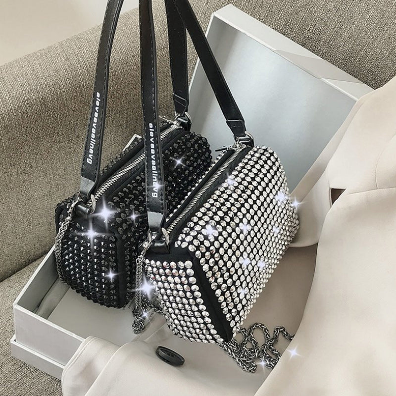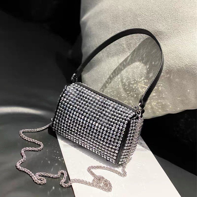 Die Tasche ist mit einer langen Kette mit Strasssteinen und einem kurzen PU-Riemen ausgestattet, der in der Hand getragen oder an der Schulter gehängt werden kann.