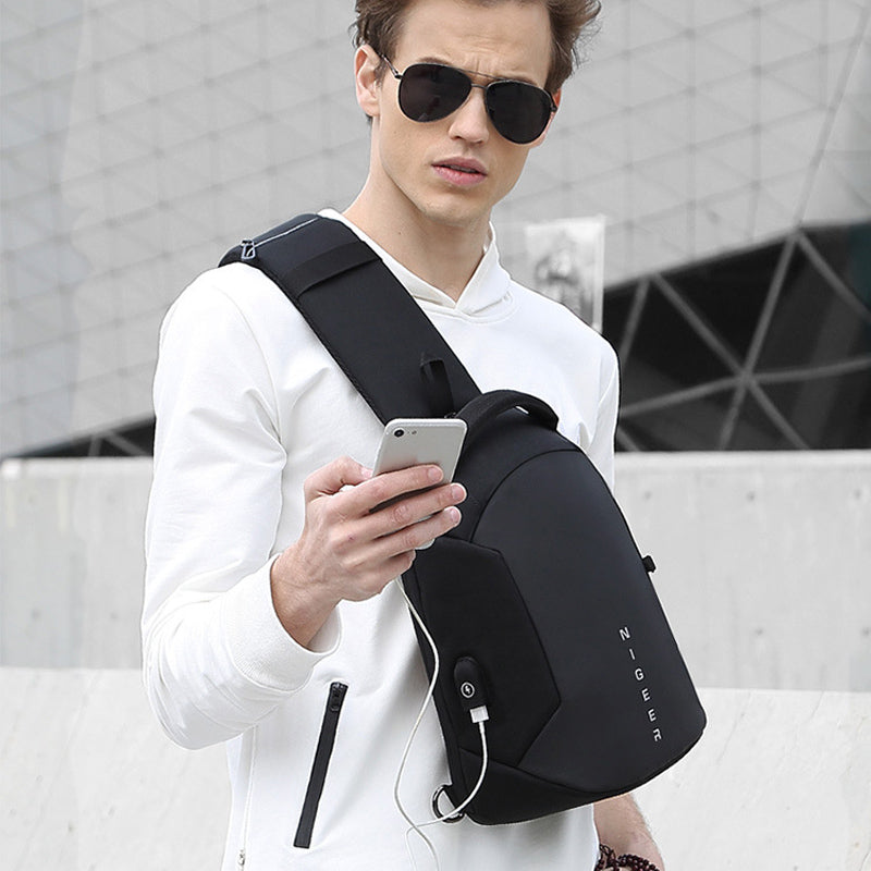 Laufen Sie zum Flughafen oder ins Fitnessstudio, während Sie in dieser coolen und stylischen Crossbody-Brusttasche mit USB-Ladefunktion alles Wichtige auf dem Rücken haben.