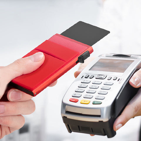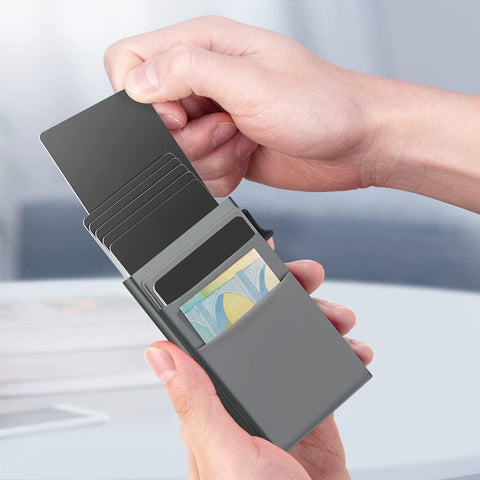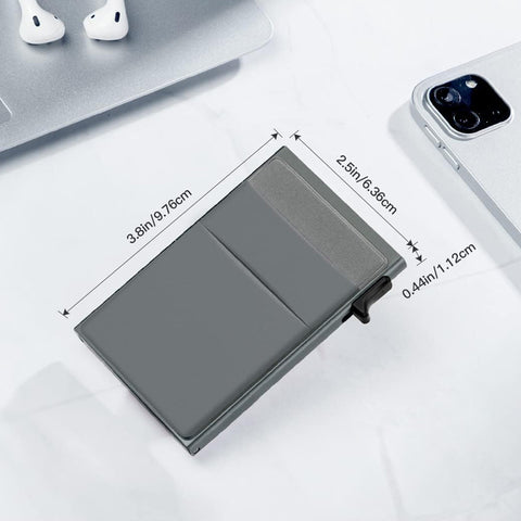 👔 Schneller Zugriff, große Kapazität – Das Fummeln mit Pop-Up-Kartenetuis sollte der Vergangenheit angehören. Unser charakteristischer automatischer Mechanismus wirft Ihre Karte per Knopfdruck aus. Aluminium-Kartenbox für 6 Karten. 2 zusätzliche Fächer bieten Platz für 2–3 Karten und ein paar Geldscheine, die tatsächliche Kapazität hängt von der Kartenstärke ab.