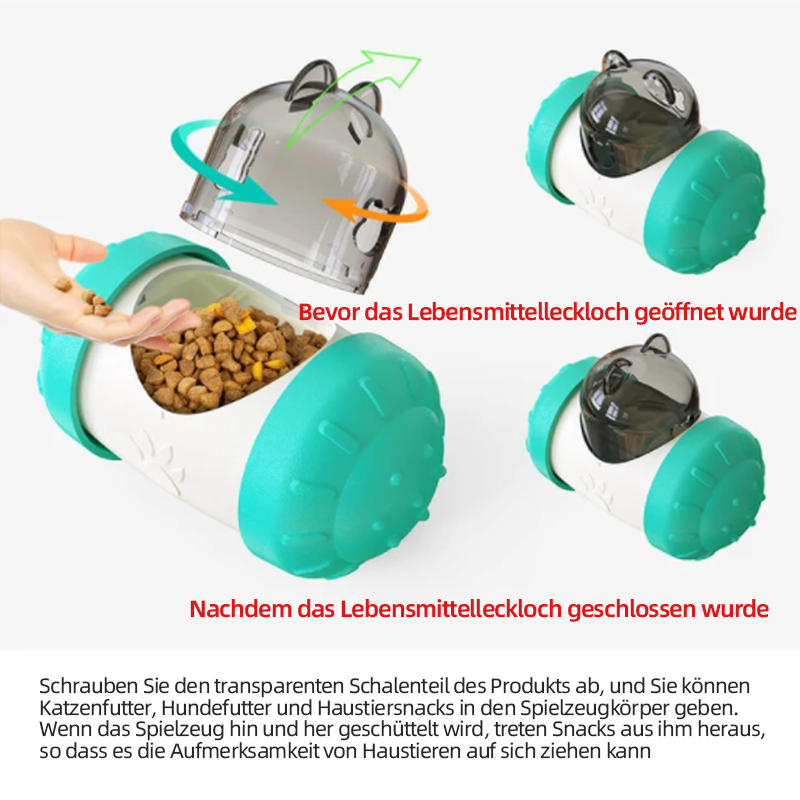 • [Einfache Verwendung] Schrauben Sie den transparenten Schalenteil des Futterteiler-Spielzeugs ab, um Katzenfutter, Hundefutter und Haustiersnacks in den Spielzeugkörper zu geben. Wenn das Spielzeug hin und her wackelt, treten Snacks aus, die die Aufmerksamkeit der Haustiere auf sich ziehen und sie zum Weiterspielen anregen.