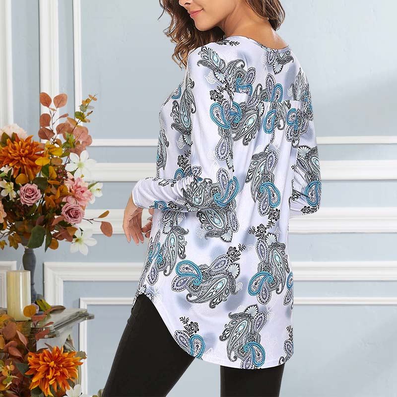 • Böhmisches Musterdesign / Blumendruckmuster / Lange Ärmel / V-Ausschnitt / Knopfverschluss / Plissee vorne / Fließender unterer Saum