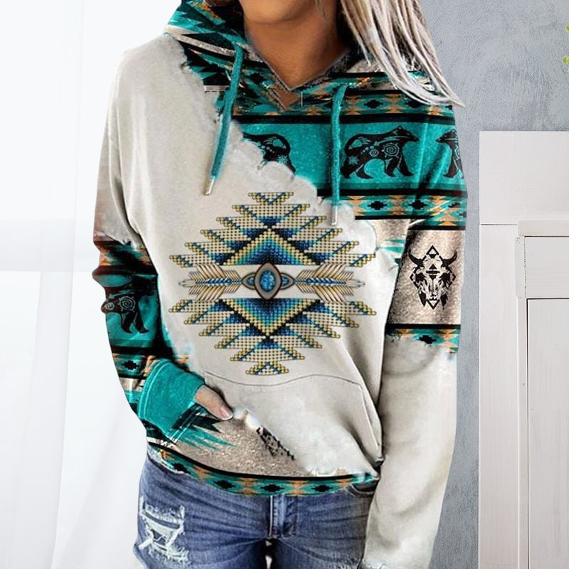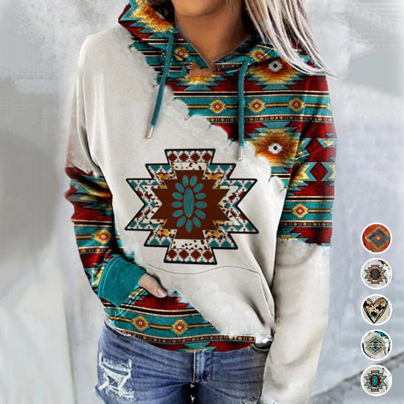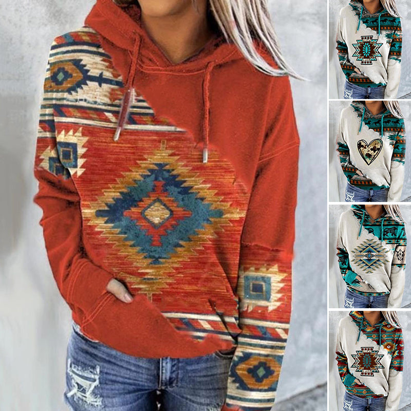 • ✿ Design: Kapuzenpullover mit ethnischem Aufdruck, ausgefallener Grafikdruck, lange Ärmel, Pullover-Sweatshirt, Kängurutasche vorne