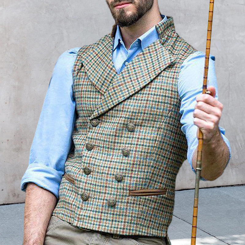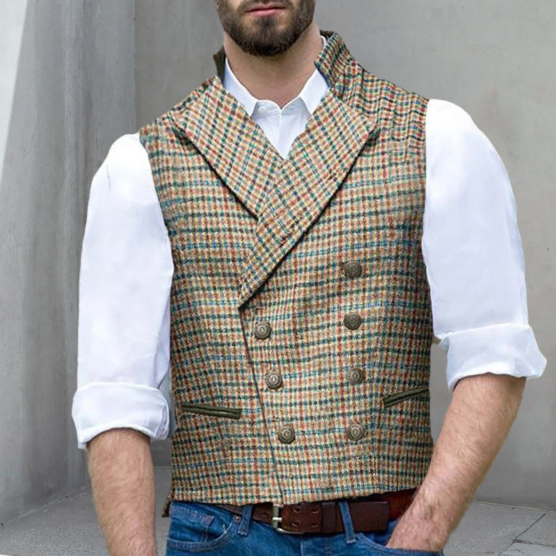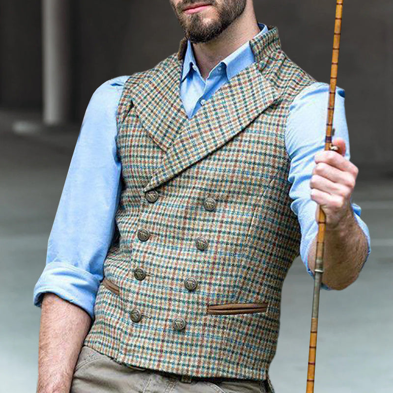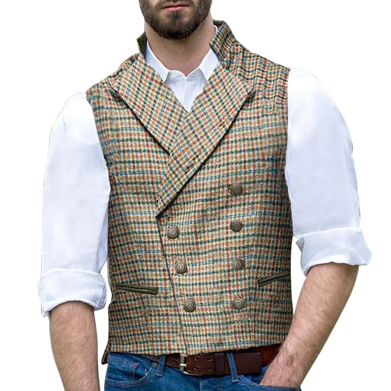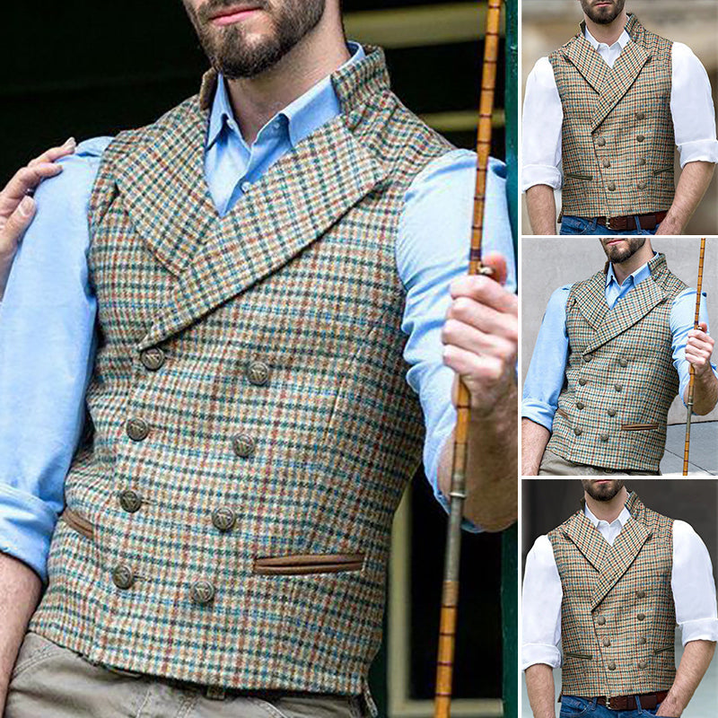 - 1 * Karierte, zweireihige, schmale Cargoweste mit Anzugkragen