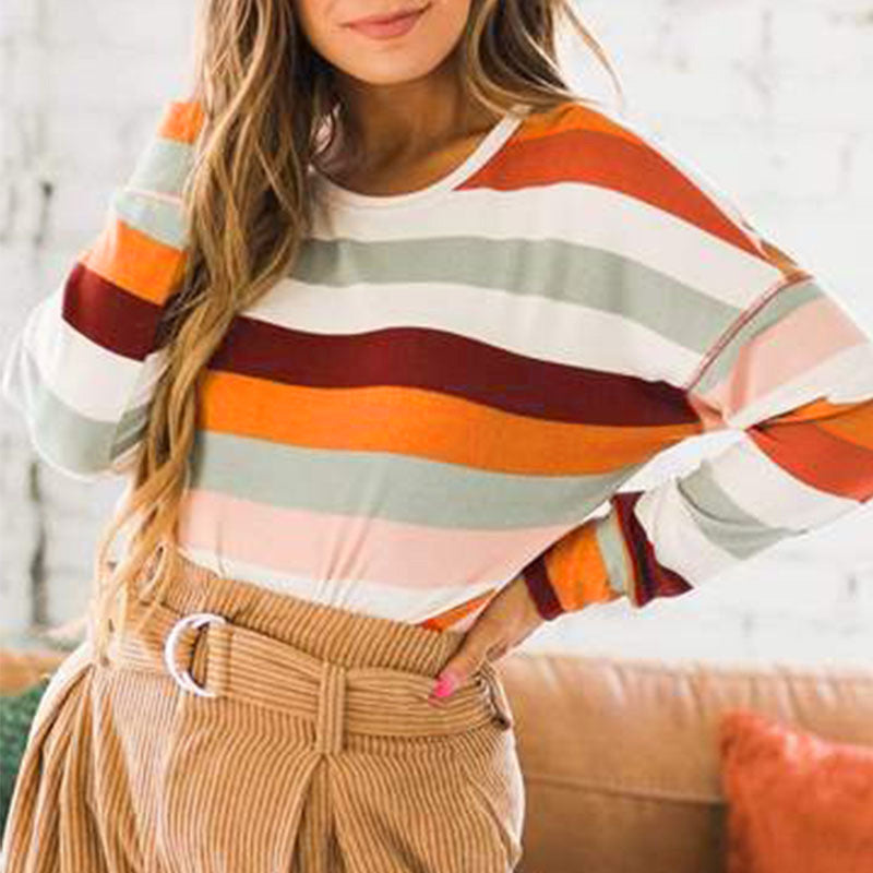 • Paket: 1 * Kontrastgestreiftes Langarm-T-Shirt mit Rundhalsausschnitt