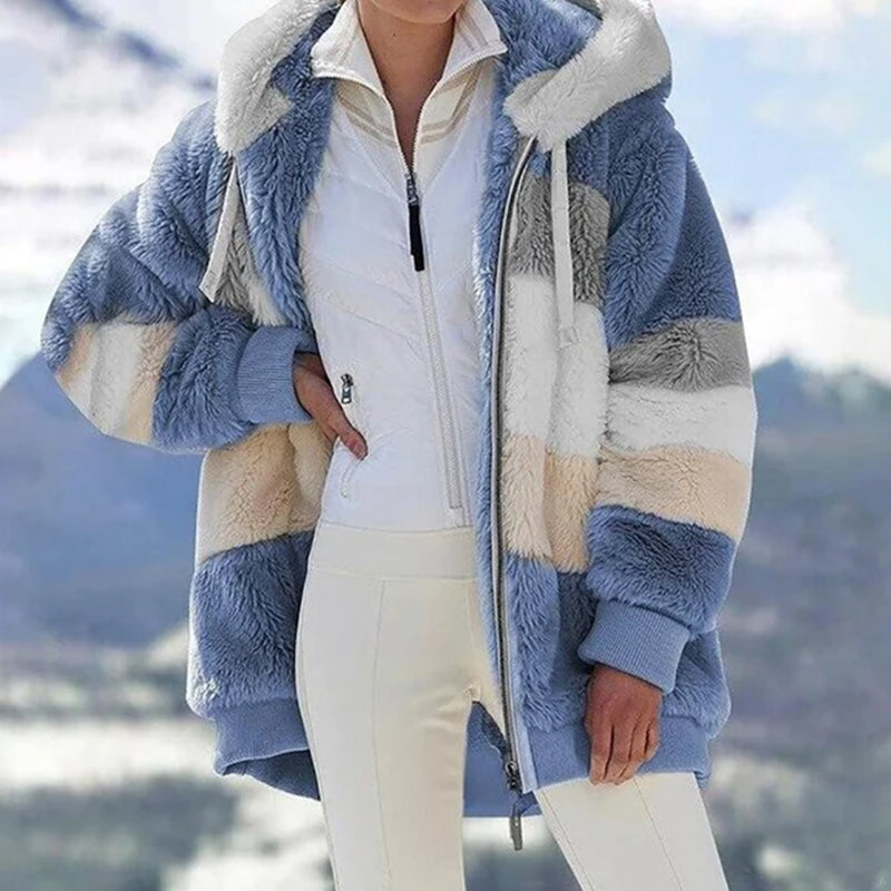 • 【Neuartiges Design】: Fuzzy-Jacken für Damen sind mit einer klassischen Kapuze und einzigartigen Farbblockstreifen gestaltet. Eine Hauptfarbe und 3 Hilfsfarben bilden ein perfektes Verhältnis zur Kontrastfarbabstimmung. Im trüben Winter der Schönste zu sein. Wickeln Sie sich im kalten Winter in diesen warmen Plüschmantel und genießen Sie das Vergnügen des ganzen Winters.