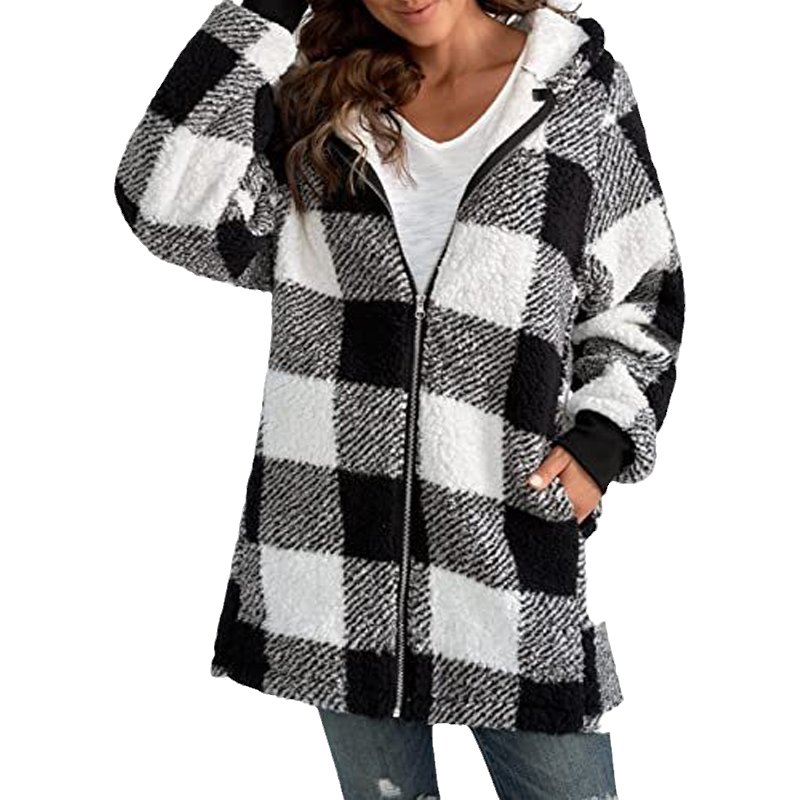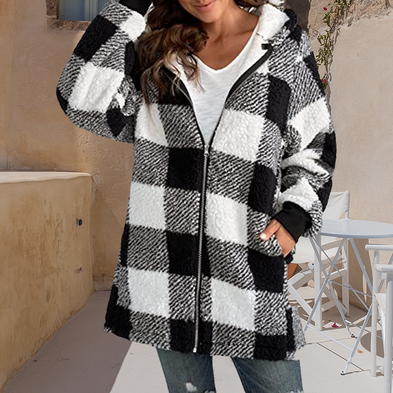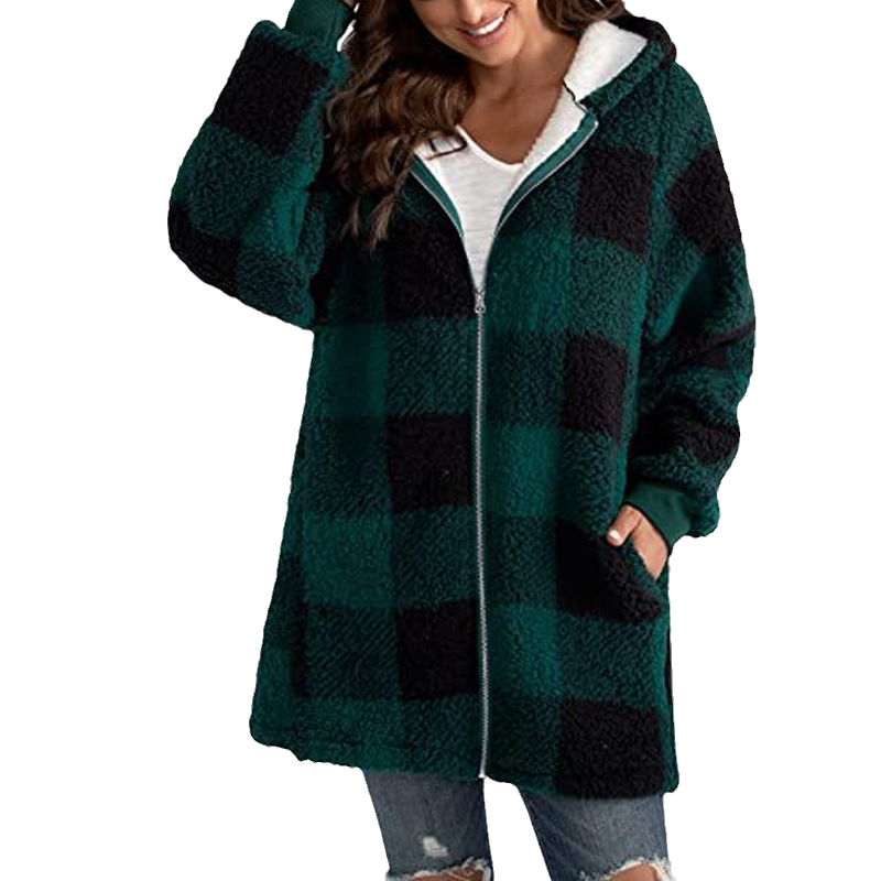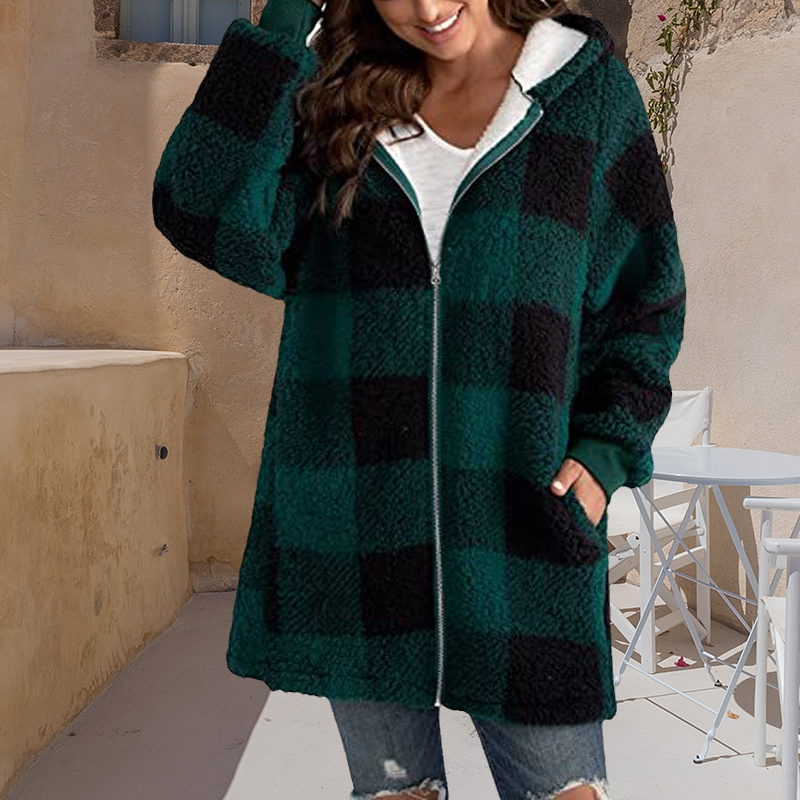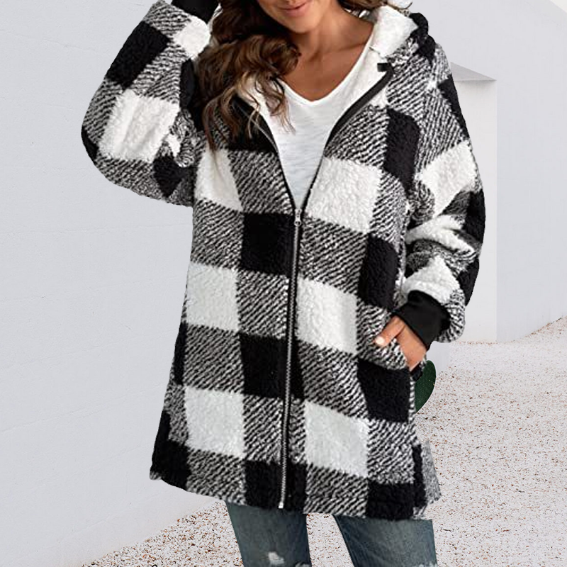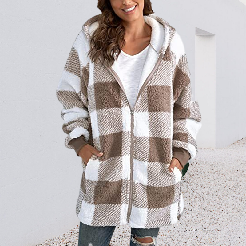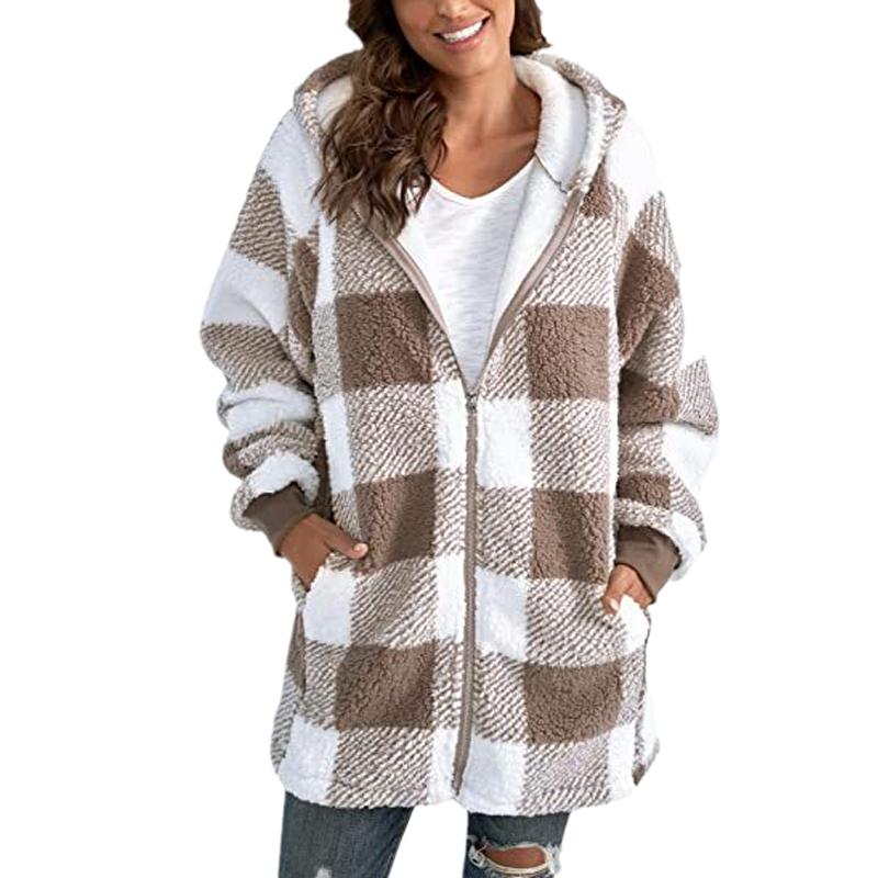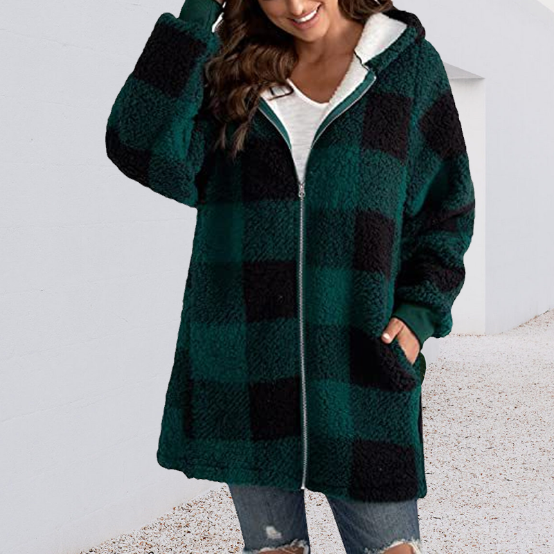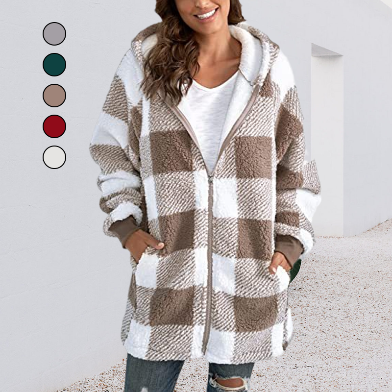 Merkmale - Kapuzenpullover mit Reißverschluss vorne und Taschen. Es ist lässig und dehnbar und vermittelt ein Gefühl von Komfort, Wärme und Entspannung. Ein karierter Jackenmantel!