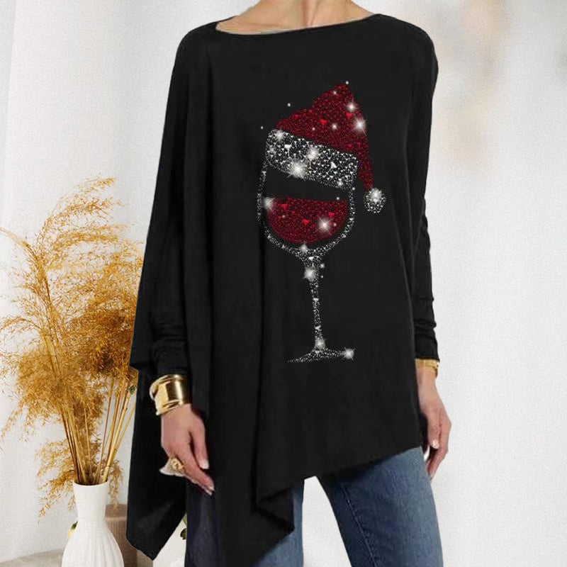 ❤【Eigenschaften】Lockerer und fließender Saum, unregelmäßiger Saum, lange Ärmel, Rotweinglasmuster, süßes lässiges Damen-Langarm-T-Shirt, weich und modisch. lockeres Hemd, einfarbig, Rundhalsausschnitt