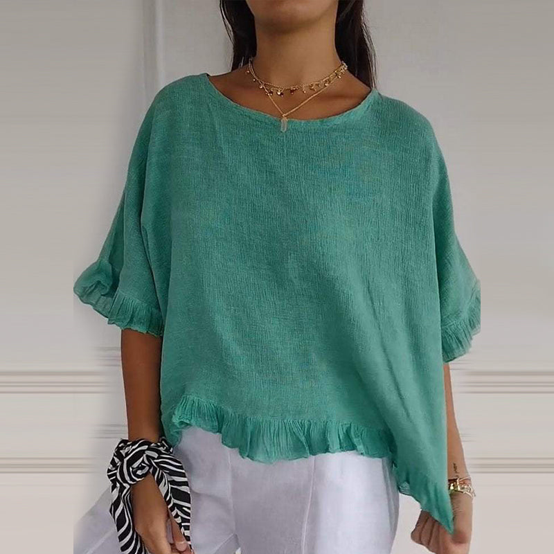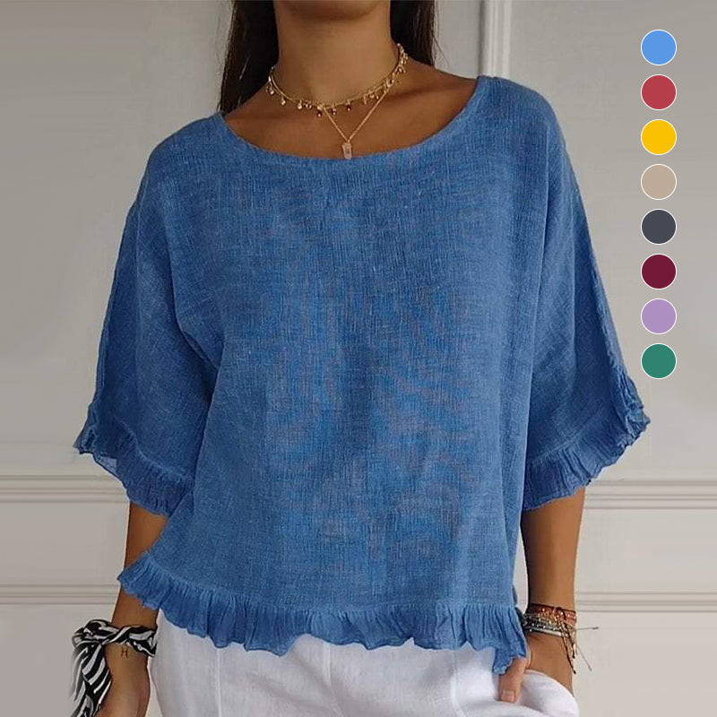 🌸Frühlingsstimmung in einem Top! 🌼 Holen Sie sich jetzt Ihr Baumwoll-Leinen-Top mit Rundhalsausschnitt, Rüschensaum und halblangen Ärmeln für einen bequemen und dennoch stylischen Look!🌿