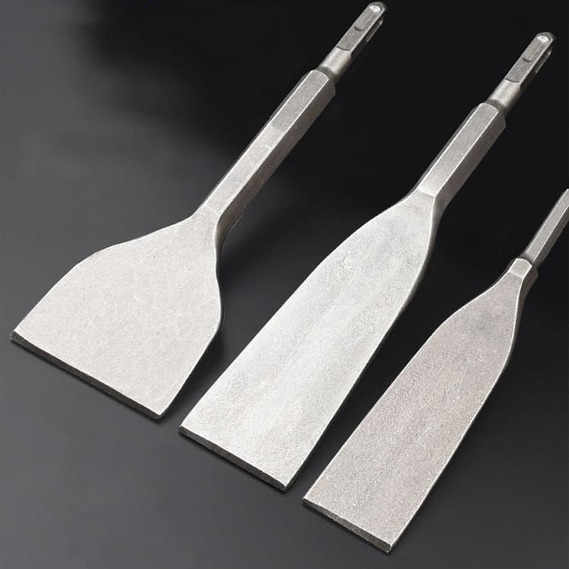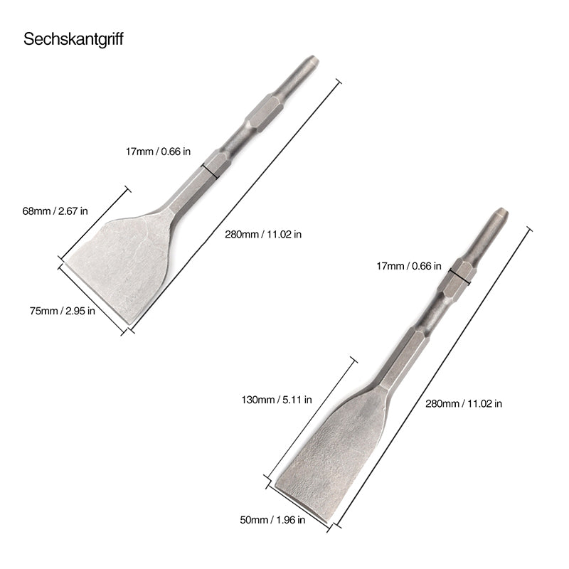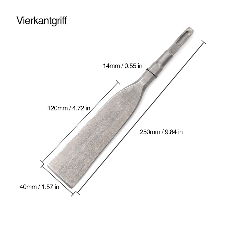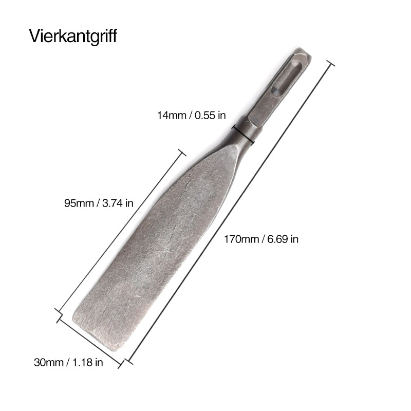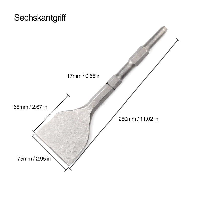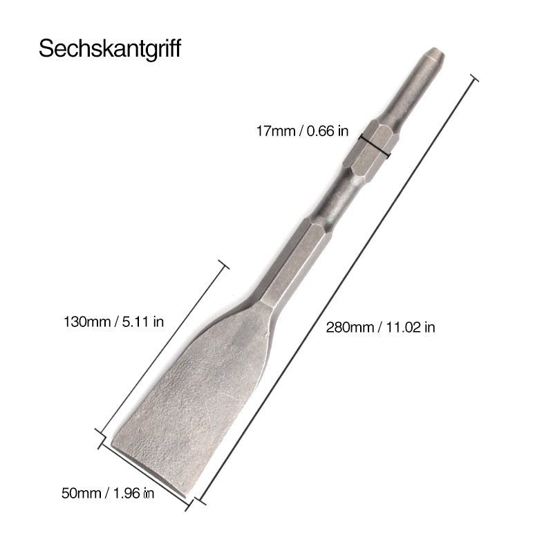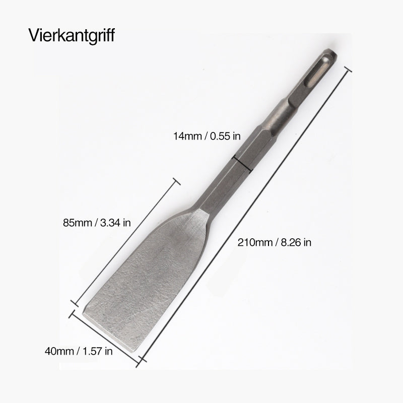 Hohe Qualität: Hergestellt aus hochwertigem 40RC-Stahl, sehr robust für eine lange Lebensdauer. Hergestellt aus einer hochwertigen, gehärteten Stahllegierung mit Wärmebehandlungsprozess ist dieser Stechbeitel sehr hart und langlebig, um Sie bei allen Arten von Scaling-Arbeiten zu unterstützen, besonders gut zum Entfernen von alten Fliesen, Dünnbett, Mörtel und anderen Klebstoffen.