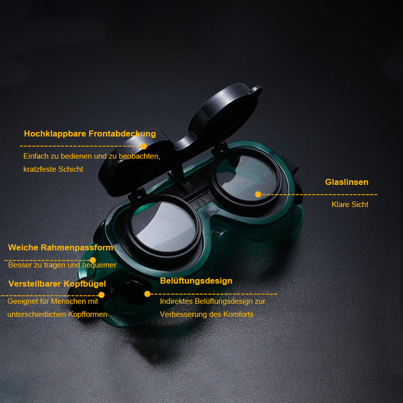 • 【Funktion】- Die Schweißerbrille mit einfach hochklappbarem dunklem Schirm und Belüftungsöffnungen, Riemen um den Kopf mit dem verstellbaren Befestigungsband, dichtet die Augen ab und bietet Ihnen hervorragenden Schutz beim Schweißen und Schneiden von Metallen.