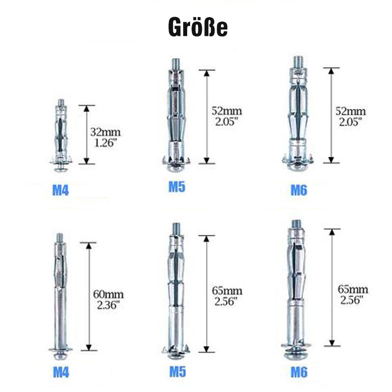 Verschiedene Größen: Für die meisten Wände sind verschiedene Größen erhältlich, mit einer großen Auswahl an Schraubengrößen, aus denen Sie wählen können, um Ihren unterschiedlichen Anforderungen gerecht zu werden. Geeignet für Hohlwände aller Dicken.
