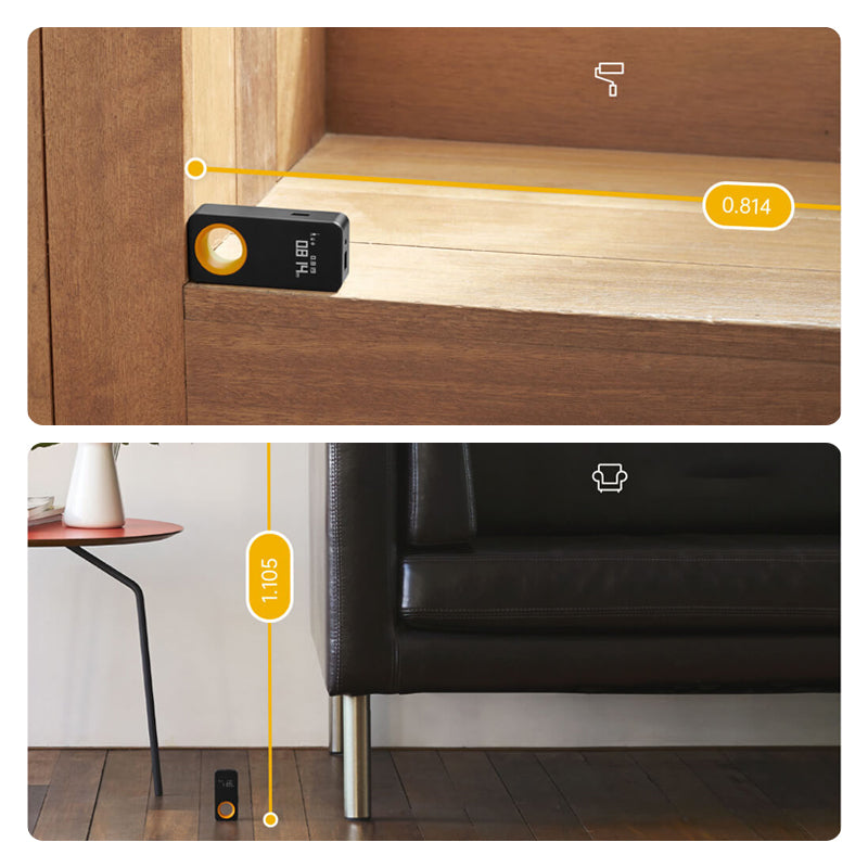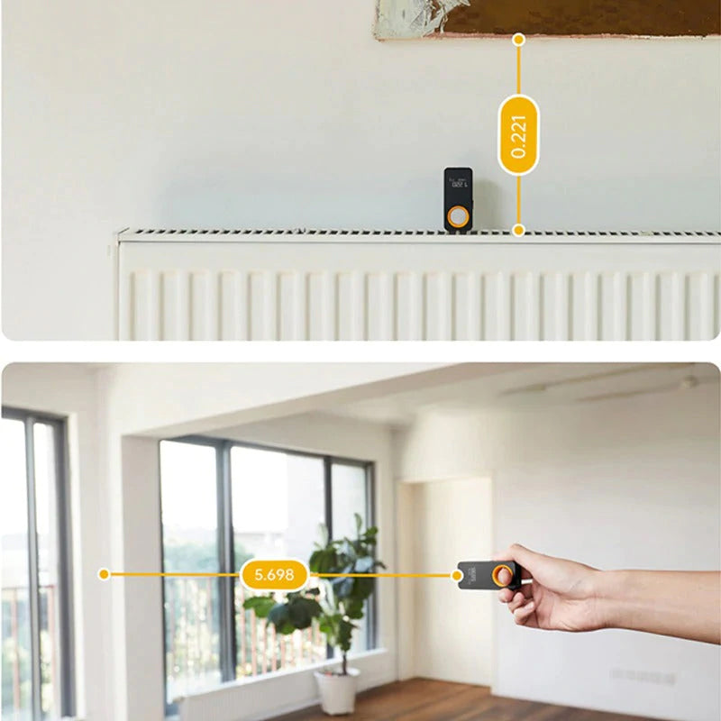 VERSCHIEDENE FUNKTIONEN: Das digitale Maßband kann über Bluetooth mit Mobiltelefonen verbunden werden, wodurch die Funktionen in App erweitert werden, z. B. Datenspeichernotizen, Grundrisszuordnung und reale Messung. Und es ist bequem, die Maßeinheiten in App zwischen M/Ft umzuschalten.