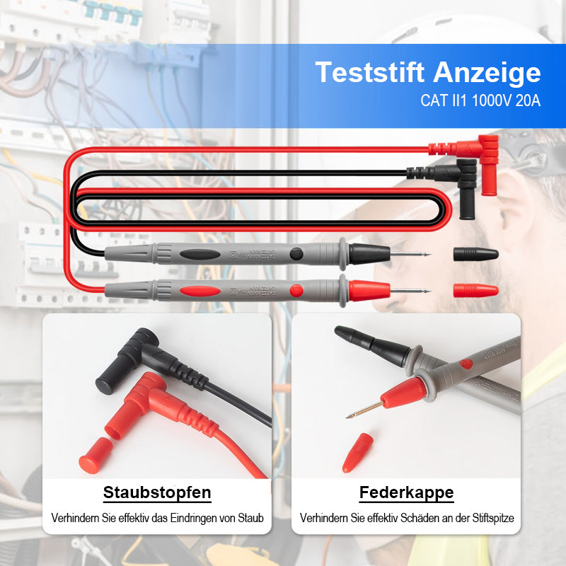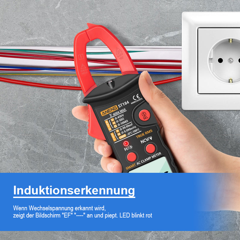 • NCV-Erkennungsfunktion: Die berührungslose Spannungserkennung überprüft effektiv den elektrischen Status durch Messung der EM-Feldstärke, ohne Drähte zu berühren; Die NCV-Taste liegt auf der rechten Seite. Legen Sie einfach Ihren Daumen darauf und drücken Sie.