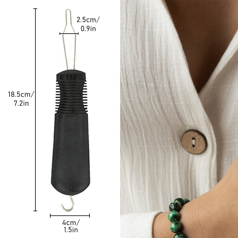 Die Stahldrahtschlaufe ist schlank und dennoch langlebig. Die Drahtschlaufe lässt sich leicht durch kleine Knopflöcher gleiten, ist glatt und verfängt weder den Stoff noch die Knopflochfäden. Die Drahtschlaufe verengt sich an der Spitze, um den Knopf zu verriegeln und das Ziehen durch das Knopfloch zu erleichtern. -