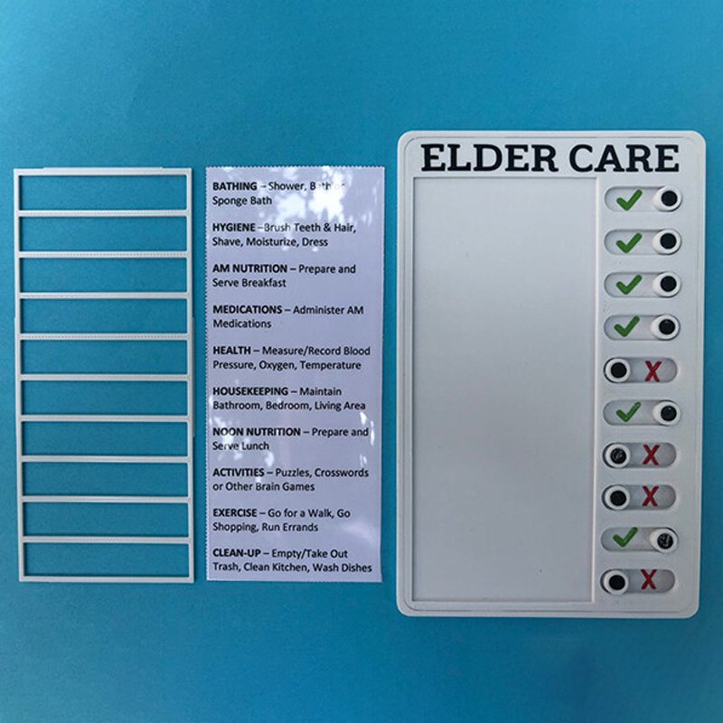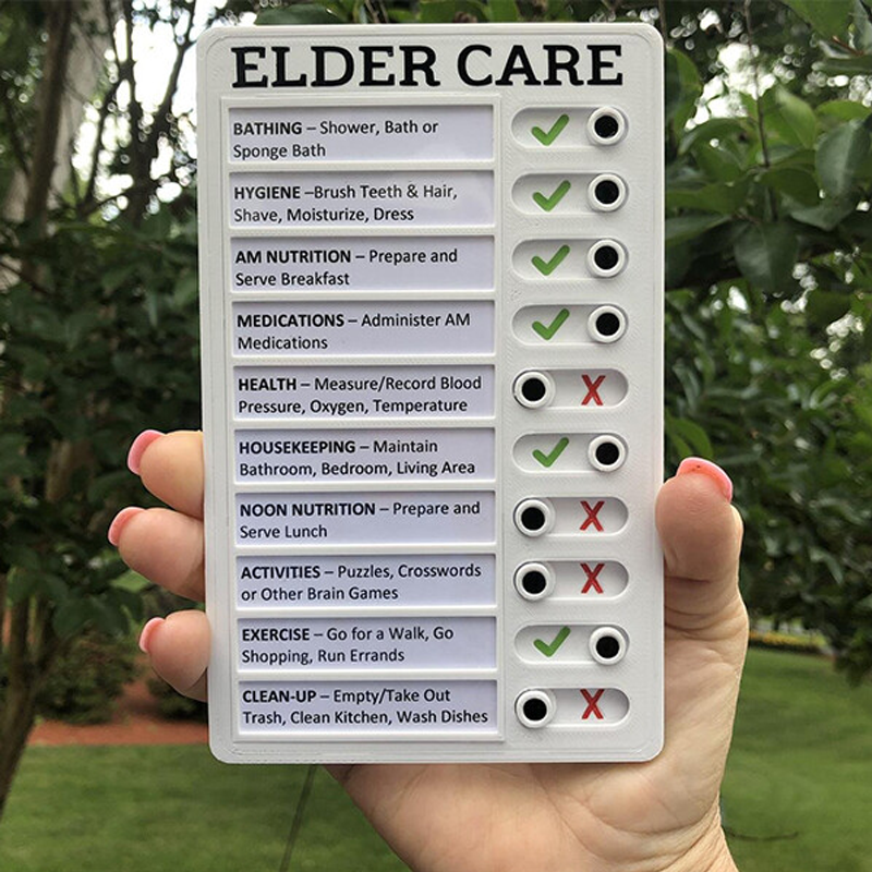 Die Checkliste „ELDER CARE“ hilft Pflegekräfte daran zu erinnern, Hausarbeit und Aktivitäten für ältere Menschen zu erledigen. Nachdem jede Aktivität abgeschlossen ist, klickt der Schieberegler zum Abschluss und der Erziehungsberechtigte kann die Liste jeden Tag überprüfen und zurücksetzen.