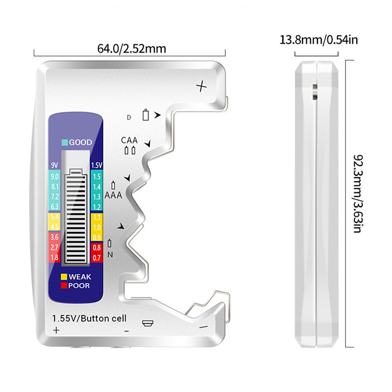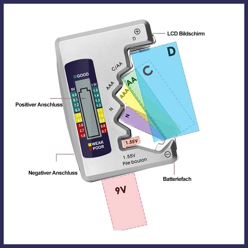 â Testbereich: C, AA, AAA, D, N, 9V (6F22) and 1.55V Knopfbatterie