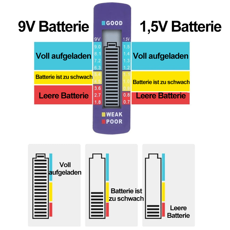 â Geeignet fĂŒr Kohle-, Zink-, Alkali- und wiederaufladbare Batterien