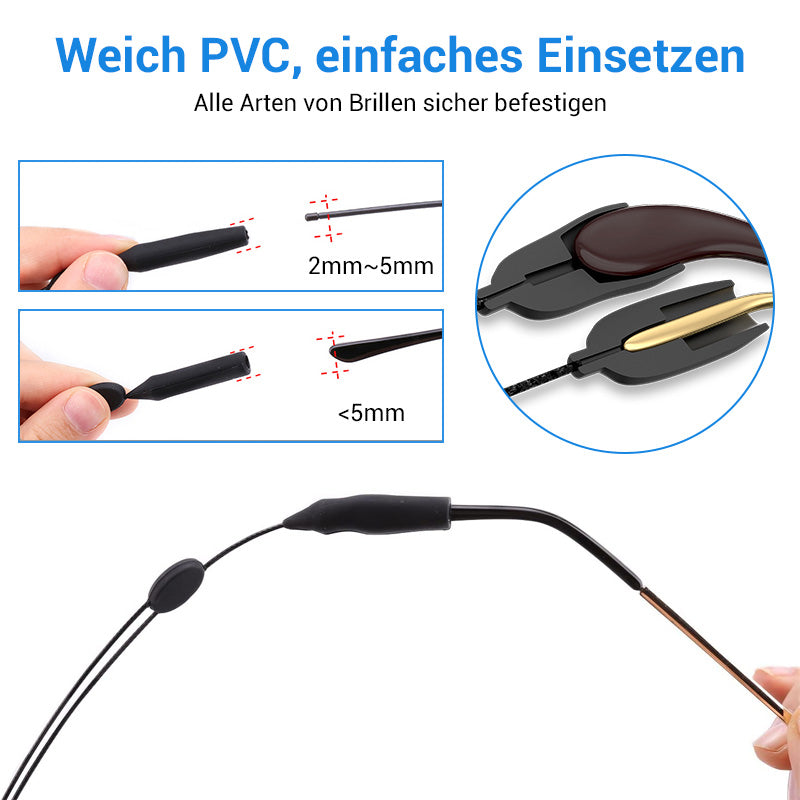 Hergestellt aus strapazierfähigem, verschleißfestem Silikonmaterial, weich und dehnbar macht es für die meisten Brillen, Sonnenbrillen oder Lesebrillen geeignet. Die weiche und glatte Oberfläche drückt nicht auf Kopf und Ohren.