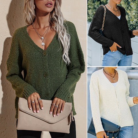 V-Ausschnitt, lange Ärmel und Knopfleiste.