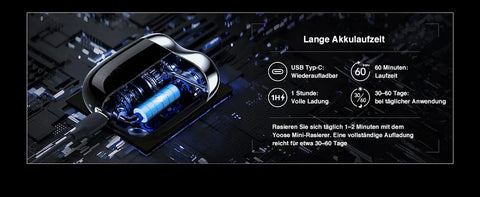 Eine schnelle Vollladung von 1 Stunde sorgt für eine Laufzeit von 60 Minuten, genug für 30 Tage täglichen Gebrauch. Über die USB-Schnittstelle ist das Aufladen bequem und der Computer, das Notebook, das mobile Netzteil usw. können aufgeladen werden.